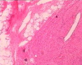外阴脂肪瘤生长于阴阜、阴唇或外阴其他脂肪组织处,肿瘤大小不一,大多呈小息肉状,最大有时可达10~12cm直径。大多无蒂或带蒂。质地较软,瘤表面呈分叶状,瘤外有包膜。生长缓慢。恶变机会亦少。故一般无不适症状,如肿瘤体积较大,则会有行走不便或性交困难,如肿瘤沿膀胱阴道隔伸展至阴道旁组织,则可阻碍分娩。切面组织呈黄色同一般脂肪组织。镜下见成熟脂肪细胞,脂肪细胞群间有少量纤维此种肿瘤具有特殊的柔软性。