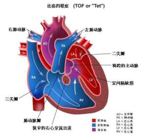 法洛四联症(TOF)是一种常见的先天性心脏畸形。其基本病理为室间隔缺损、肺动脉狭窄、主动脉骑跨和右心室肥厚。法洛四联症在儿童发绀型心脏畸形中居首位。法洛四联症患儿的预后主要取决定肺动脉狭窄程度及侧支循环情况,重症者有25%~35%在1岁内死亡,50%病人死于3岁内,70%~75%死于10岁内,90%病人会夭折。主要是由于慢性缺氧引起,红细胞增多症,导致继发性心肌肥大和心力衰竭而死亡。
