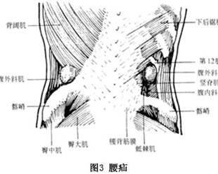 在12肋及髂嵴之间,腹腔内脏经腹壁或后腹膜突出称为腰疝(1umbarhernia),亦称背疝。1672年Barbotte首先报道本病Budgen(1728)首次报告了先天性腰疝Garangeot(1731)在尸检中发现第1例腰疝嵌顿者,而第一例腰疝修补手术是由Ravanton(1750)医生完成的1783年Petit详细描述了下腰三角的解剖界限并报道了1例腰疝嵌顿病人因此下腰三角又被命名为Petit三角在1866年之前鶒,外科医生认为所有的腰疝均由下腰三角疝出,直到Grynfeltt提出了上腰三角(Grynfeltt三角)的存在后,临床医师才逐渐对腰疝有了全面的认识。腰疝疝囊位于腰区的肌肉之间,可发生在上腰三角或下腰三角临床较为罕见。