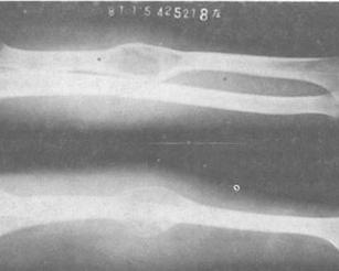 单房性骨囊肿(solitary bone cyst)囊内为一单腔,里面衬以薄膜并含草黄色液体,骨囊肿常位于肱骨和股骨上干骺端,年龄大的患者常位于髂骨,跟骨和掌跖骨,约2/3的病例无任何症状,1/3的病例局部有隐痛,酸痛,轻压痛,少数病人局部包块和骨增粗,绝大多数患者在发生或反复发生病理骨折而就诊,囊壁多因外伤甚至病理骨折后意外发现,除外伤外一般没有疼痛,股骨上端病变常因步态异常才引起注意。[1]