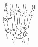 第一掌骨基部骨折指第一掌骨基部1厘米处的骨折,多为横行或粉碎骨折。第一掌骨基部骨折点近端受拇长展肌的牵拉,向桡侧背侧移位,骨折远段受拇长屈肌及拇内收肌的牵拉,向掌侧尺侧移位,骨折部呈向背侧桡侧成角畸形。[1]