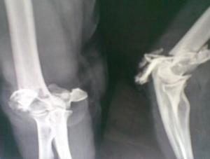 肱骨上端有三个骨骺,即肱骨头、大结节及小结节,顺序于1岁、3岁及5岁出现骨骺,于5~8岁三个骨骺融合成为肱骨上端一个骨骺,至19~21岁骨骺与肱骨干融合。因此,肱骨上端骨骺分离多见于7~18岁;以后成人可发生肱骨解剖颈骨折。由于肱骨上端在额状面上肱骨干骺端形成15°左右的后倾角,骨骺中心位于骺板的内后侧,因此,沿肱骨干向上传导的暴力作用于骺板,产生剪切应力,造成骨折线呈斜形,前外侧部分经过骺板面骨骺分离,后内侧部分经过干骺端时,形成一个三角形骨片,骨折线倾斜程度随年龄而异,年龄越大则骨折线经过骺板之横行距离越短,干骺端骨折片越大,且使倾斜面距离越长,骨折端越不稳定。