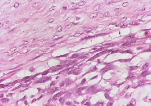 骨外软骨肉瘤是发生于软组织的软骨肉瘤,可分为黏液型、间叶型及分化型。因分化型少见,本文仅介绍前二型。黏液型好发于50岁左右的中年男性,大腿和膝关节多发。本型生长缓慢,行肿瘤根治性切除,预后良好。间叶型好发于15~35岁的年轻女性,可发生于头颈部、四肢、后腹膜。本型肺转移发生率高,仅做局部广泛切除,预后不好。