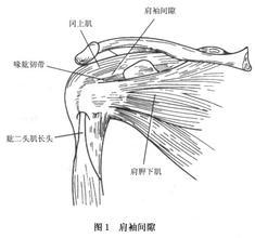喙突外侧、肩胛下肌和冈上肌之间的肌间隙称肩袖间隙。该间隙内有疏松结缔组织,连接冈上肌和肩胛下肌,间隙前方有喙肱韧带使之得到加强。肩袖间隙分裂是肩袖组织顺肌腱纤维方向的纵形撕裂。肩袖间隙是肩袖结构的薄弱部位,一旦发生分裂,冈上肌与肩胛下肌在上臂上举过程中的合力作用减弱,肱骨头在肩盂上的固定力量下降,易使盂肱关节发生松弛与滑脱。盂肱关节不稳定又可造成肩胛下滑囊的炎症和粘连,进一步可继发关节挛缩。肩袖间隙分裂多见于青壮年人,发病年龄在20~40岁较多。