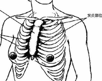 肋软骨炎,又称前胸壁综合征,是前胸部疼痛常见的原因,由于疼痛部位在前胸,很容易于心绞痛混淆,患者常误以为自己有冠心病,病因一般与外伤有关,在人们搬运重物,急剧扭转或因胸部挤压等使胸肋关节软骨造成急性损伤、或因慢性劳损或伤风感冒引起病毒感染,导致胸肋关节面软骨的水肿,增厚的无菌性炎症反应而发病。[1]