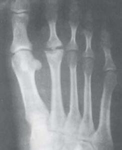 跖骨头骨软骨病是发生在跖骨头骨的无菌性坏死。多发生在15-16岁青少年,女性更常见。偶见于成年。坏死常发生在第二跖骨头,偶见于第三跖骨头。根据X线检查,可分为早、中、晚三期:早期表现为跖骨头骨骺致密,边缘不齐;中期为骨骺碎裂,关节间隙增宽;晚期关节腔变窄,变平,骨质硬化,关节内有游离体,出现退行性关节病变。