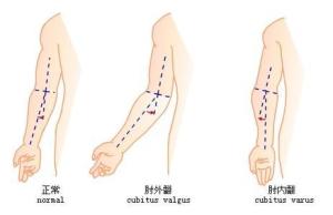 肘内翻畸形:由于先天或后天因素造成尺骨轴线向内侧偏移,携物角<0°称为肘内翻。主要因外伤导致的肱骨骨折引起,消除疼痛,手术矫治是重要的治疗措施,该病一般预后较好。