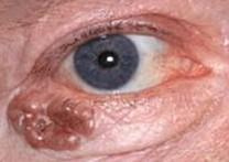 基底细胞瘤[1](basal cell carcinoma)亦称蚕蚀性溃疡,是皮肤癌肿最多见的一种,发病率很高,占眼睑恶性肿瘤的第一位(约50%以上)。男性比女性稍多,老年人比青年人多见,年龄高峰在50~60岁之间。一般仅在局部呈浸润性生长,很少发生转移,但处理不当,或不加处理,也可能严重破坏眼部组织,甚至侵入副鼻窦及颅内而引起死亡。