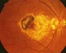 增龄性黄斑变性(age-related macular degeneration,ARMD),亦称老年性黄斑变性(senile macular degeneration,SMD)是与年龄相关的致盲的重要眼病之一,在中国,由于人口趋于老龄化,其他致盲原因得到或加强了控制,老年性黄斑变性亦日益成为重要的致盲性眼病。根据临床与病理表现,老年性黄斑变性分为2型,即萎缩型(atrophic senile macular degeneration)与渗出型(exudative senile macular degeneration)萎缩型老年性黄斑变性主要为脉络膜毛细血管萎缩、玻璃膜增厚和视网膜色素上皮萎缩等所致的黄斑区萎缩变性;渗出型老年性黄斑变性主要为玻璃膜破坏脉络膜血管侵入视网膜下形成新生血管,导致视网膜和(或)色素上皮有浆液和(或)出血。