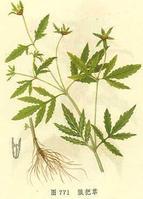 狼把草(学名:Bidens tripartita L.)又名:鬼叉、鬼针、鬼刺等,属菊科一年生草本。茎直立,高30~80厘米,有时可达90厘米;由基部分枝,无毛。叶对生,茎顶部的叶小,有时不分裂,茎中、下部的叶片羽状分裂或深裂;裂片3~5,卵状披针形至狭披针形;稀近卵形,基部楔形,稀近圆形,先端尖或渐尖,边缘疏生不整齐大锯齿,顶端裂片通常比下方者大;叶柄有翼。头状花序顶生,球形或扁球形;总苞片2列,内列披针形,干膜质,与头状花序等长或稍短,外列披针形或倒披针形,比头状花序长,叶状;花皆为管状,黄色;柱头2裂。
