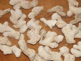干姜是生姜的干品。生姜系多年生草本,高40~100cm。叶2列,线状披针形,长15~30cm,宽约2cm,光滑无毛。花茎自根茎生出,高约20cm;穗状花序卵形至椭圆形;苞片淡绿色,卵圆形;花冠黄绿色,裂片披针形;唇瓣中央裂片长圆状倒卵形,较花冠裂片短,有淡紫色条纹及淡黄色斑点;雄蕊微紫色。本品栽培时很少开花。 我国大部分地区有栽培。主产四川、贵州.云南罗平。 冬季采挖,除去茎叶及须根,洗净晒干或低温干燥后,即成干姜。