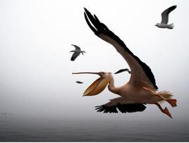 鹈鹕,鹈鹕属8种水禽的统称[1]。身长约150厘米,全身长有密而短的羽毛,羽毛为白色、桃红色或浅灰褐色。嘴长30多厘米,具有下嘴壳与皮肤相连接形成的大皮囊;皮囊可以自由伸缩,是它们存储食物的地方。尾羽根部有个黄色的油脂腺,能够分泌大量的油脂,油脂被用来涂抹羽毛,保持羽毛光滑柔软,便于避水。