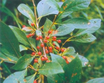 詹糖香,正名为:红果山胡椒[1],大叶钓樟,落叶灌木,高1-2m。树皮平滑,有黑斑;小枝无毛。叶互生,长圆形或倒卵状长圆形,长6.5-12cm,宽2.5-4cm,基部阔楔形,先端尖或钝,全缘,上面绿色,无毛,下面灰绿色,被毛,叶脉上被褐色毛,羽状脉,侧脉每边5-8;叶柄长1-2cm,被褐色毛或近无毛。花单性,雌雄异株,有花9朵排成腋生伞形花序,花梗被黄褐色毛;花黄色,花被6深裂,裂片椭圆形,无毛;雄花有雄蕊9,花药2室,瓣裂,全内向。核果球形,黑色,柄长12-17mm。花期4-5月。果期9-10月。